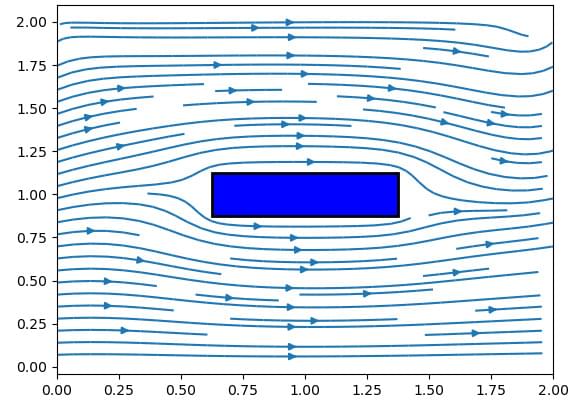 Once I had analysed these simple cases, I felt prepared to move onto more complex flows. I modelled the flow around a rectangular object in an infinite 2D plane, assuming there is no turbulence (see left). By analysing the velocities at the boundaries I could calculate the total force on the obstacle using the steady flow momentum equation. Varying the angle of attack of the 'wing' enabled me to produce a simplistic graph of lift-to-drag ratio and calculate the optimum angle of attack.