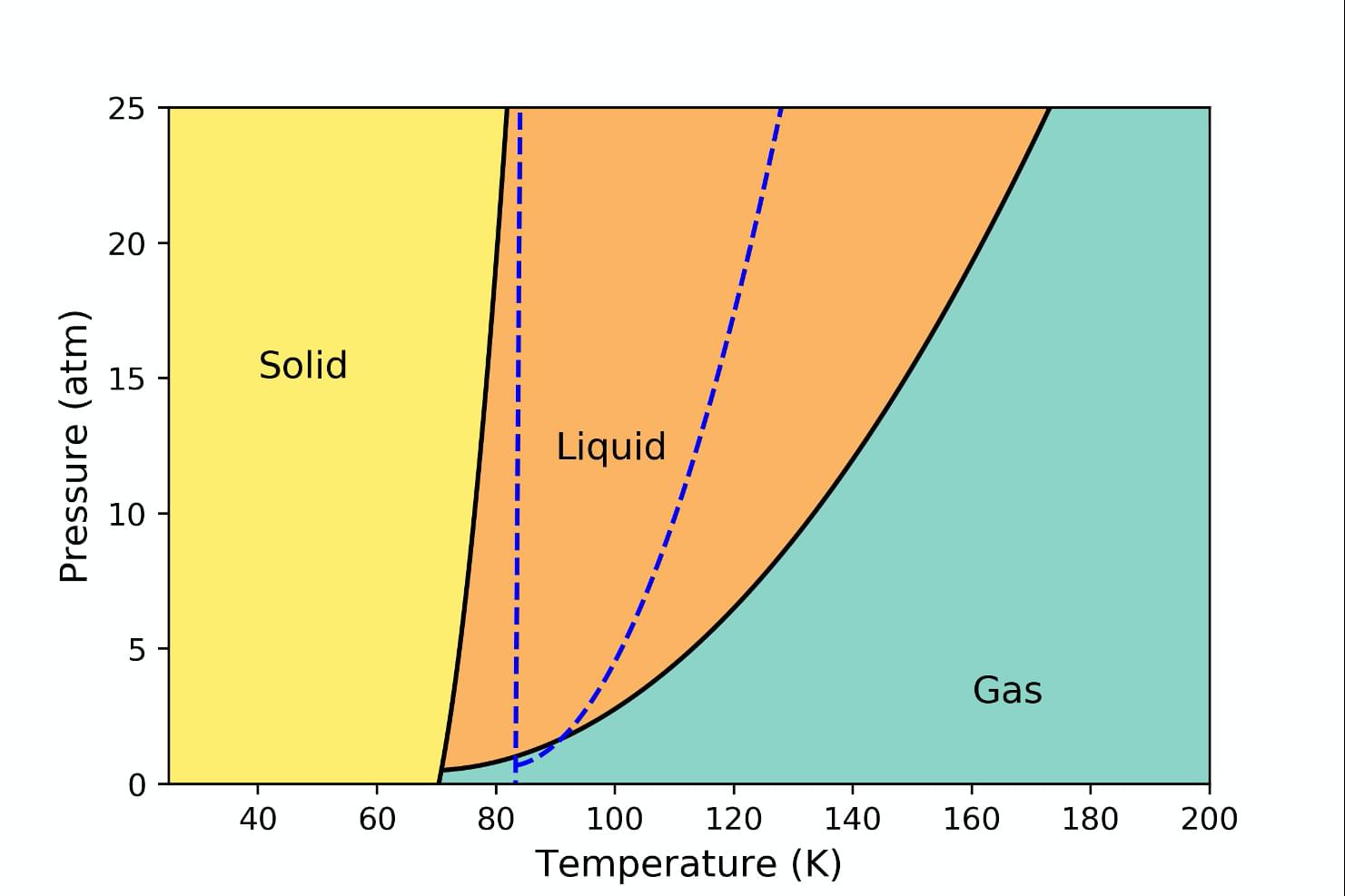 I used the time-averaged data generated from each simulation to explore the macroscopic properties of argon. Plotting the particle velocities yielded a Maxwell-Boltzmann distribution (above) which indicated the simulation was working as expected.