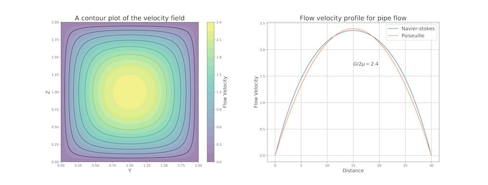 I learnt how to solve the Navier Stokes equations numerically (and analytically in some cases) for simple laminar flow through a 2D pipe. I then extended the solver to 3D and compared the calculated velocities to the analytical solution (above).
